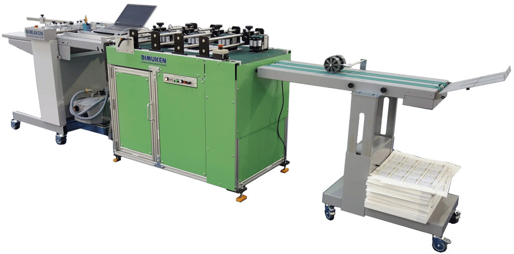 Fitted with a Deep pile feeder and Stacker delivery the system can accept sheet widths from 120mm wide up to 520mm wide with a maximum sheet length of 720mm.